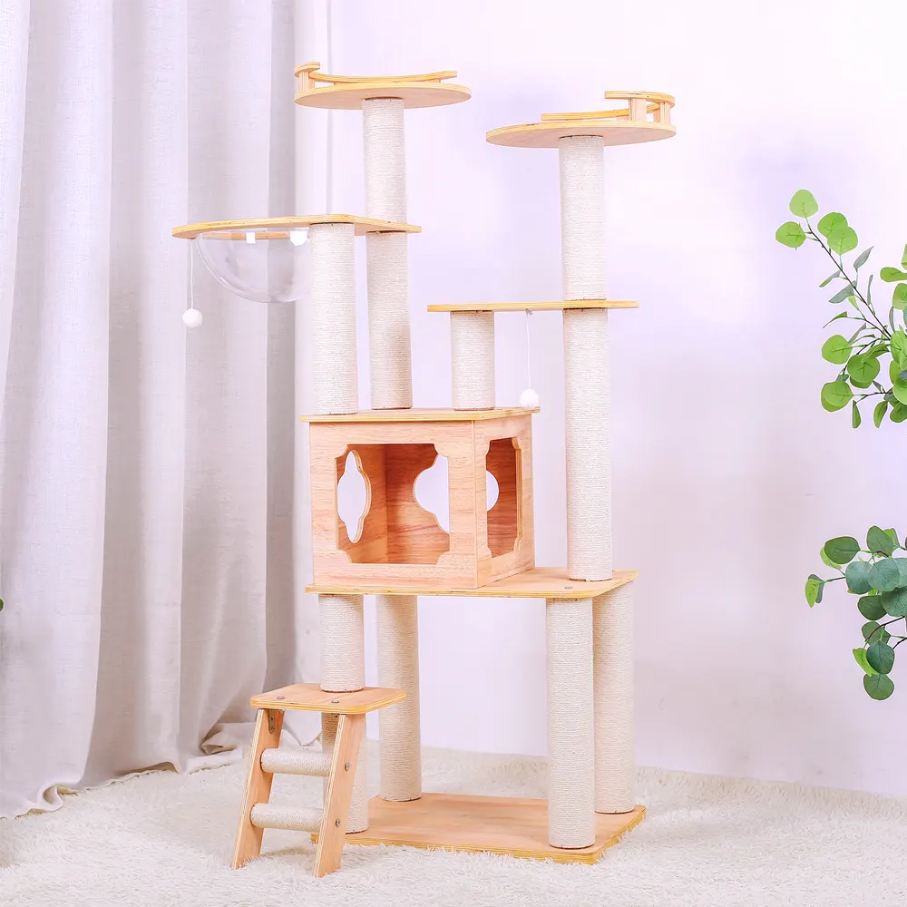 Elegant wooden cat tower with multiple levels, scratching posts, and cozy hideouts for ultimate feline comfort.
